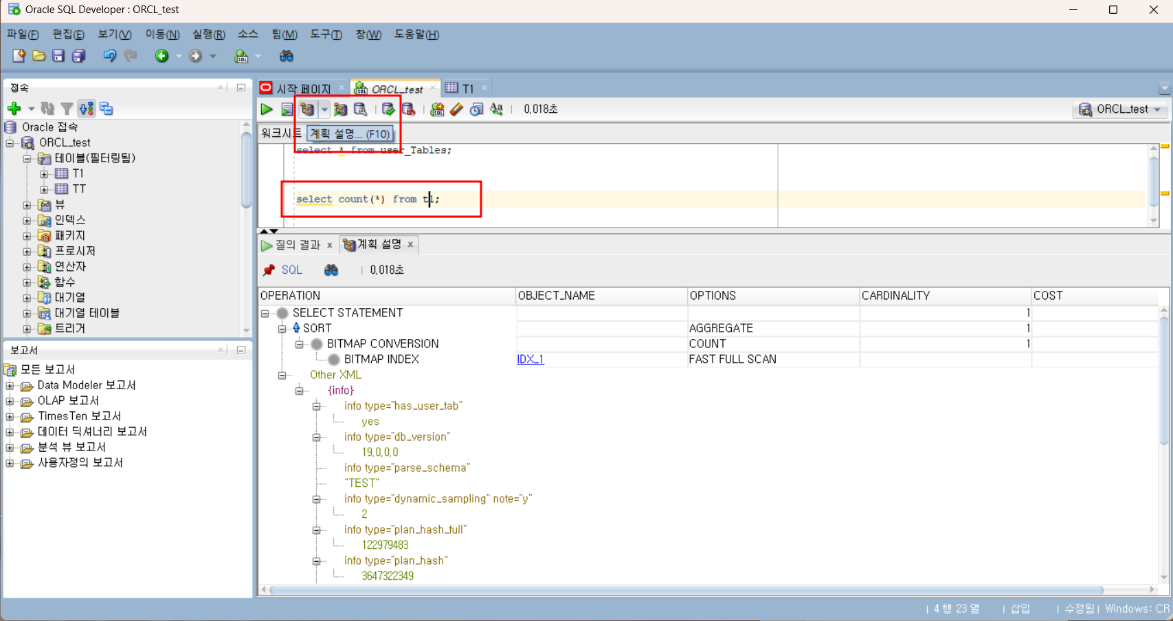 계획 설명이라는 버튼을 누르면 query plan을 확인할 수 있다