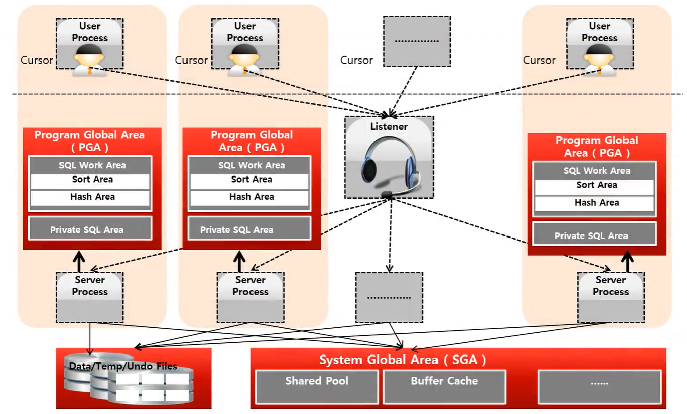 - client 가 붙으면 server process 가 생성되고 , server process는 SGA 영역을 많이 참조한다