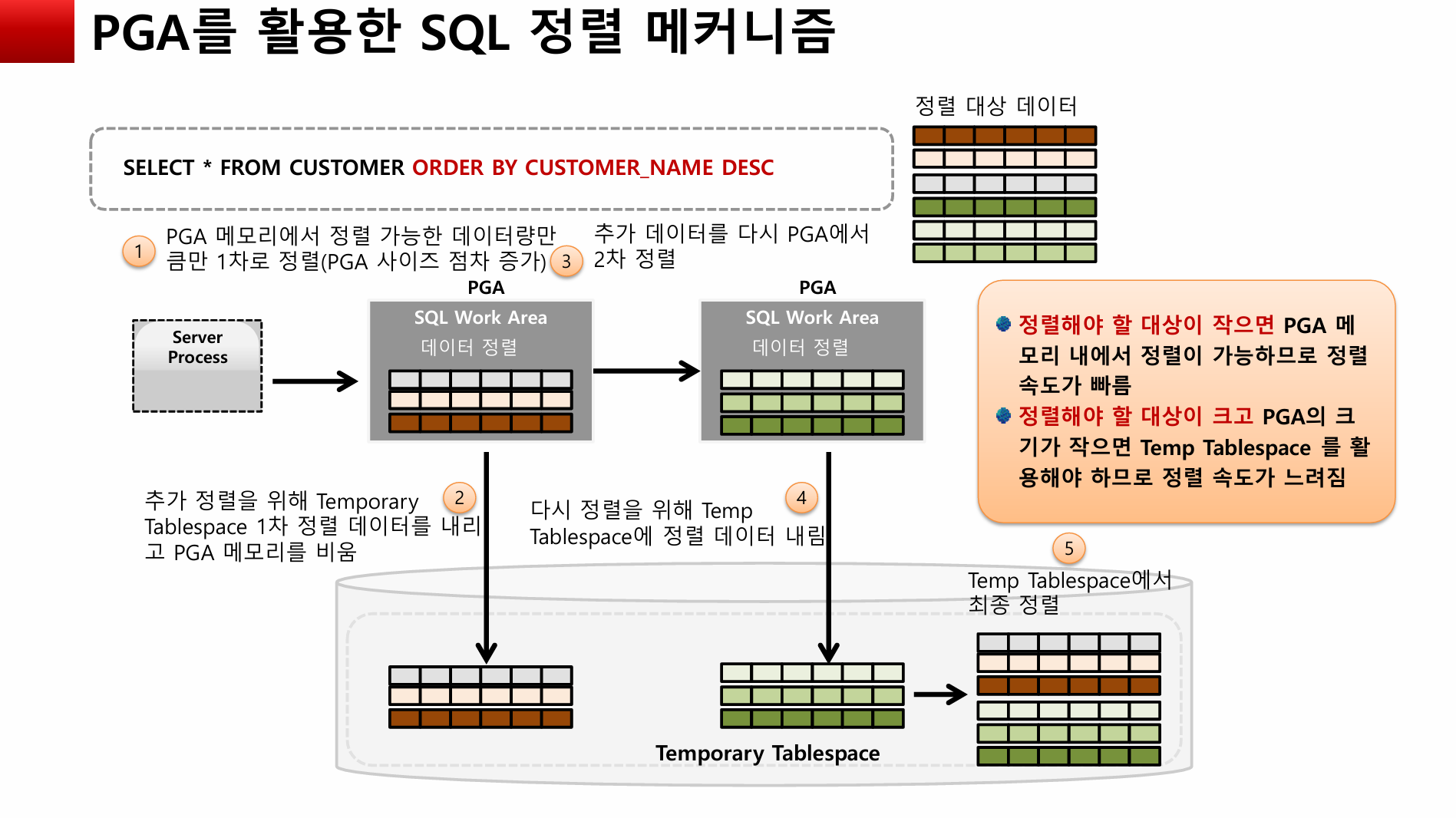 2. PGA에서 1차적으로 정렬한 데이터를 -> Temorary Tablespace 에 내린다 (PGA는 비움)