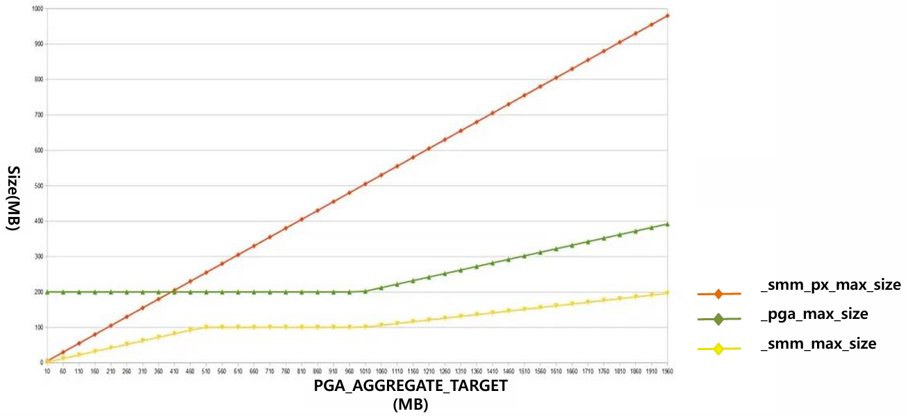_pga_max_size : PGA_AGGREATE_TARGET 사이즈의 구간에 따라 퍼센테이지가 줄어듬 ( 1G이하까진 기본적으로 200M ~ PGA_AGGREATE_TARGET 의 20%.10%.5% )