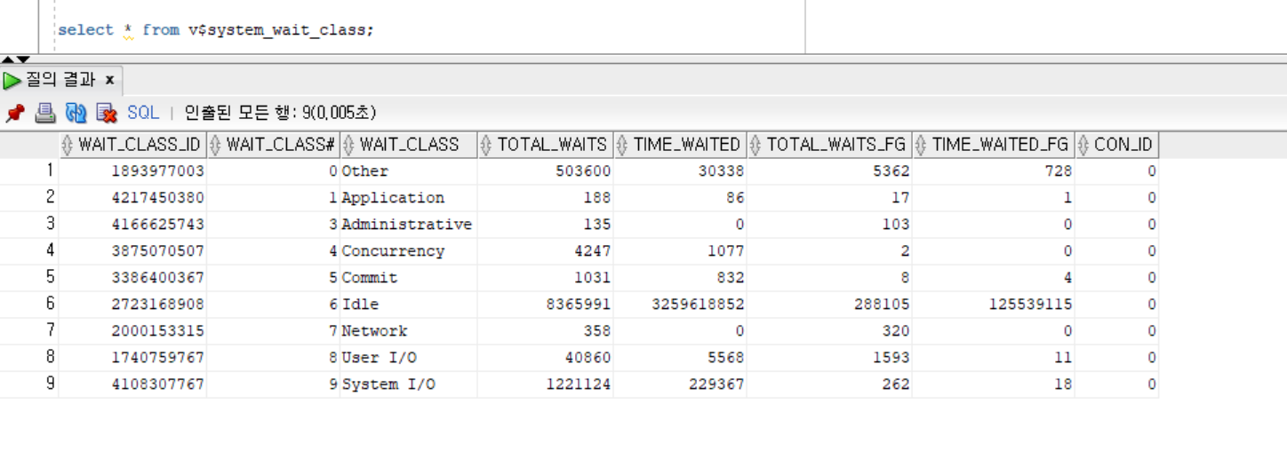 v$system_wait_class 로 Class 별로 볼 수 있다
