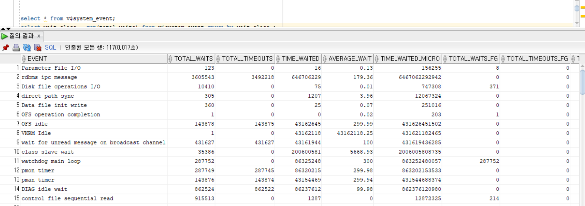 v$system_event로 하면 너무 많은 데이터가 나온다 (117개의 데이)