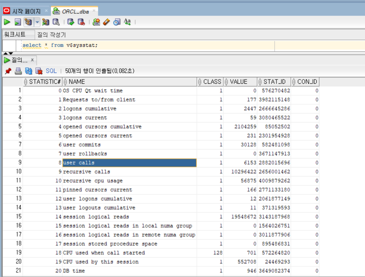 user call 횟수, session logical read 횟수 등을 볼 수 있다