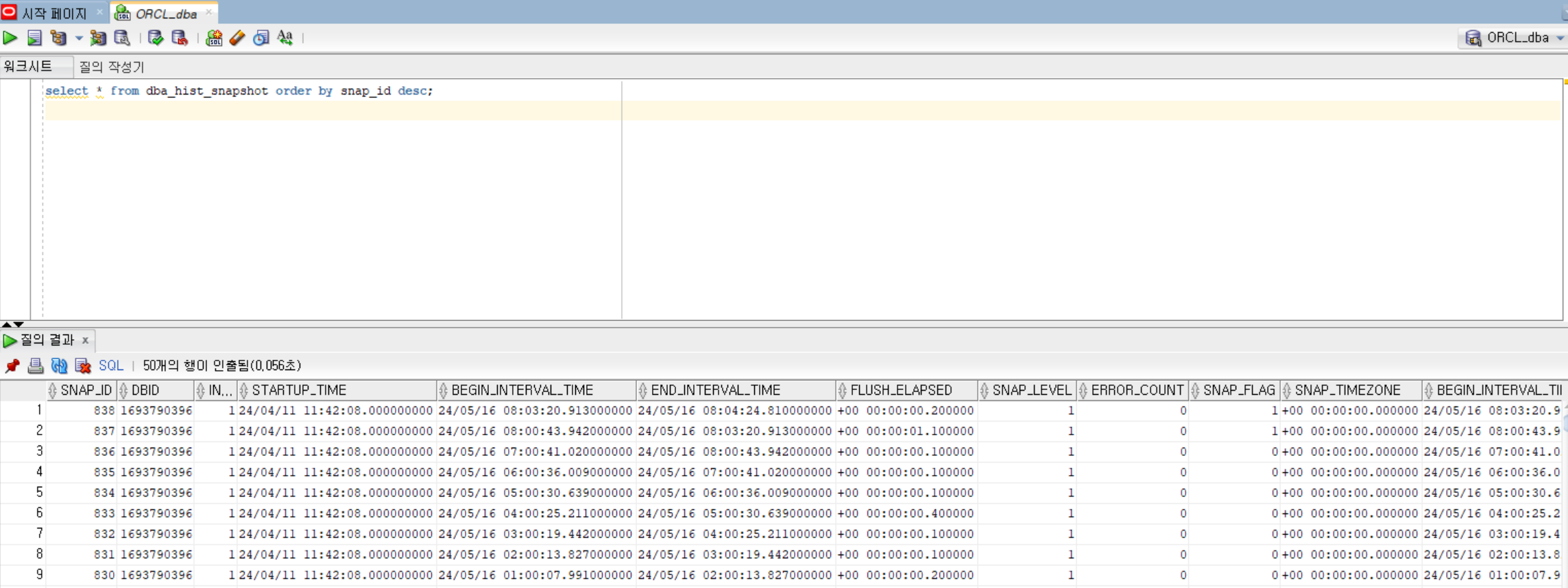 DBA_HIST_SNAPSHOT 으로 확인하기