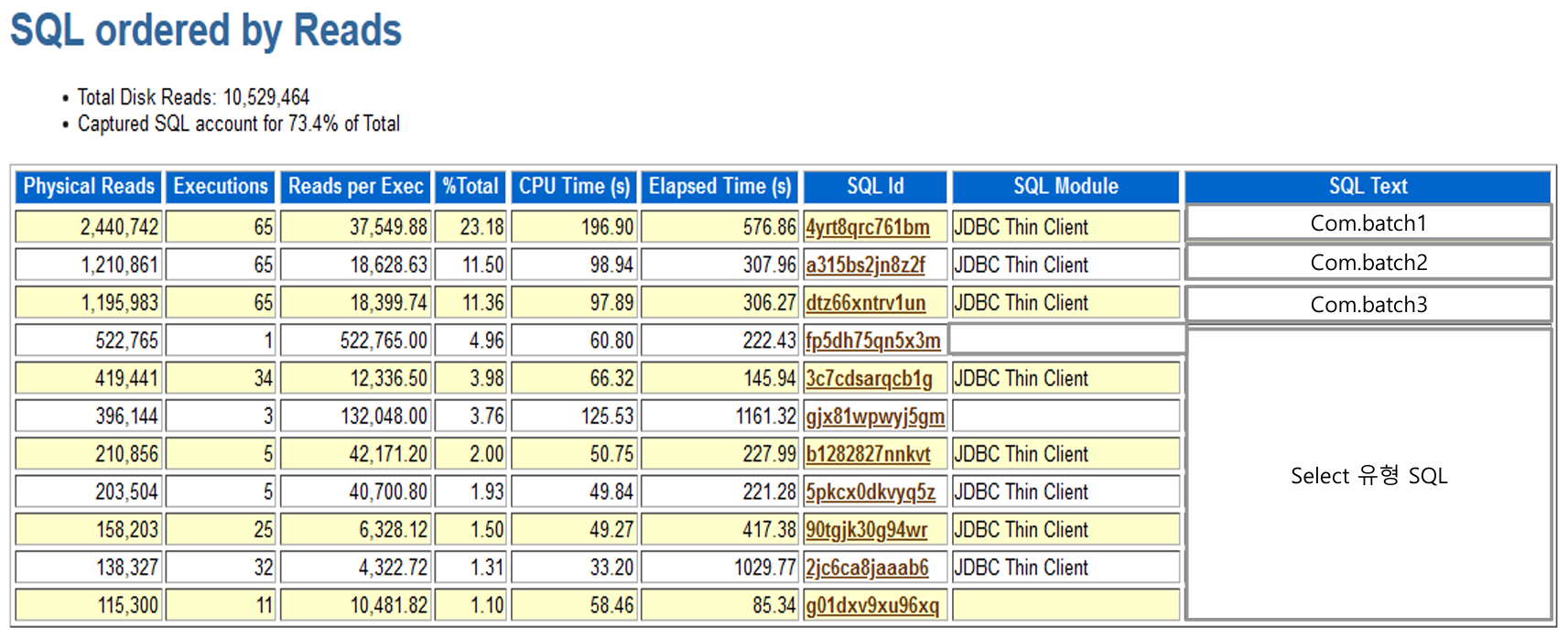 추가 자료를 보면 위에 3개가 Batch 프로그램으로 돌면서 Phsical Read 를 많이 먹는걸 알 수 있다.