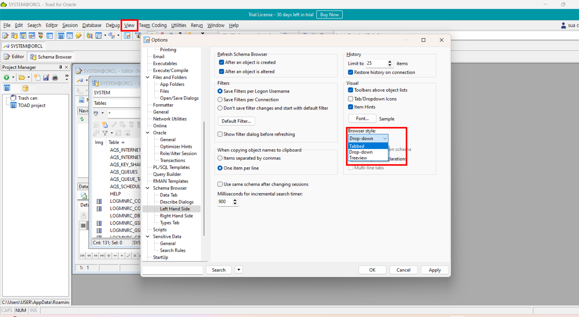 view > Toad Option > Schema Browser > Left Hand Side 에서